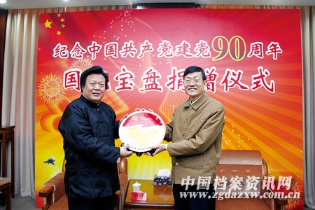 图为 中央档案馆馆长、国家档案局局长杨冬权(右)在捐赠仪式上接受捐赠的“国魂宝盘”。 宁宇龙 摄