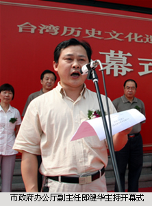 出席了展览开幕式。参加开幕式的还有各民主党派领导,各区台办和档案局(馆),各市直属单位代表和市台联会员代表等共300多人。市政府办公厅副主任郎健华主持了开幕式。
