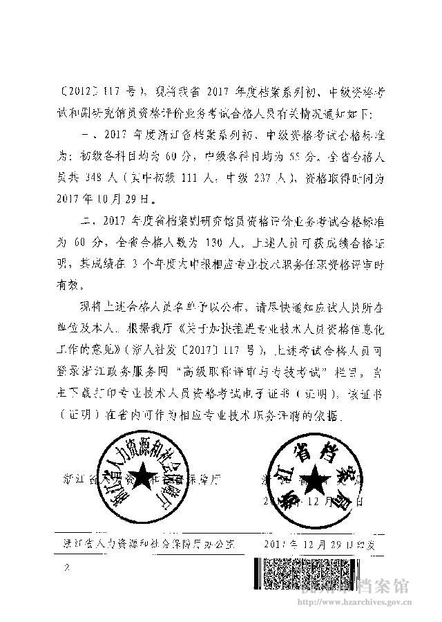 关于公布2017年度档案系列初、中级资格考试及副研究馆员资格评价业务考试合格人员名单的通知